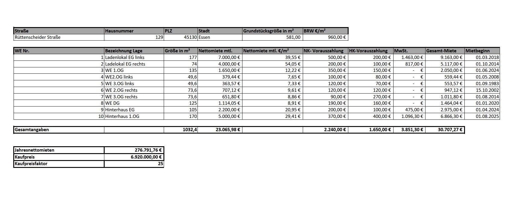 Willkommen in diesem attraktiven Wohn- und Geschäftshaus, welches sich in einer der besten Lagen von Essen-Rüttenscheid befindet! Das ansprechende Gebäude wurde im Jahre 1953 wieder aufgebaut und präsentiert sich heute in einem hervorragenden sowie modernisierten Zustand, der sowohl historische Elemente als auch zeitgemäße Annehmlichkeiten harmonisch vereint. Das Vorderhaus umfasst zwei vermietete Ladenlokale sowie 6 komfortable Wohnungen. Alle Einheiten sind derzeit vermietet und verfügen über langfristige Mietverträge, was eine stabile und zuverlässige Einnahmequelle für den neuen Eigentümer gewährleistet. Im Jahre 2020 wurde das Vorderhaus durch einen imposanten Anbau im Hinterhof erweitert, der zusätzlichen Raum und moderne Gestaltungselemente bietet. Hier wurden zwei weitere Gewerbeeinheiten im Loftstil geschaffen, die sowohl durch Ihre beeindruckende Architektur als auch durch Ihre hochwertige Ausstattung und Bauweise bestechen. Auch hier sind beide Einheiten vermietet. Dieses Wohn- und Geschäftshaus in Essen-Rüttenscheid bietet eine hervorragende Investitionsmöglichkeit in einem dynamischen Stadtteil. Mit seinen vermieteten Einheiten, langfristigen Mietverträgen und der modernen Ausstattung ist es sowohl für Kapitalanleger als auch für Eigennutzer eine attraktive Option. Überzeugen Sie sich selbst von diesem einzigartigen Angebot und vereinbaren Sie einen Besichtigungstermin!